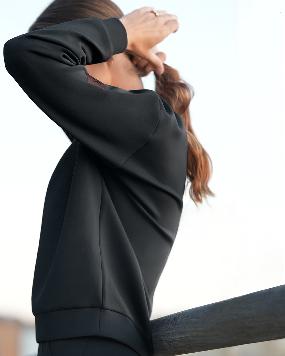 "I live for layers. This sweatshirt pairs with any of our basics, whether it’s the Cora Rib or the Wren. It’s ideal for an early morning ride. Warm up in our Devon and finish your training day in our Cora or shortsleeve Wren. Mix and match with all colors of our shirts, as well as our Alcot Breeches. Hide the Devon’s waistband seamlessly into our breeches for a more cropped look or wear it untucked with jeans for an oversized feel. Fold the cuffs up or down; they will complement the neckline either way." — Kate